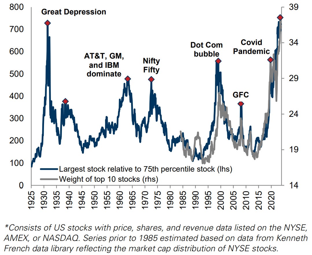 Exhibit 4. Market Cap of Largest US Stock Relative to 75th-Percentile Stock (x) (left axis); Weight of Top 10 Stocks in S&P 500 (%) (right axis)